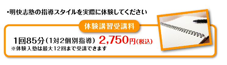 まずは,無料学習相談をお申し込みください。その際に、明快志塾の授業内容、受講システムについても詳しくご説明いたします。その上で無料体験授業を受講していただき、現在の学習状況を把握して、今後の学習目標を明確にします。それに基づいて、これからの授業計画や授業料などをご相談させていただきます。